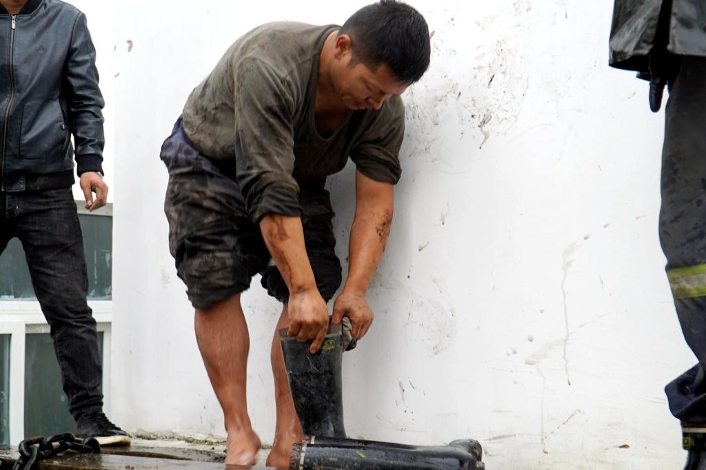 黨員蘇光輝帶頭用鐵锨鏟、洋鎬刨清理管道下的淤泥,長時間的搶險,讓他的雙手已經(jīng)開始腫脹,在休息的那一刻,手抖地擰礦泉水瓶蓋都有些吃力。