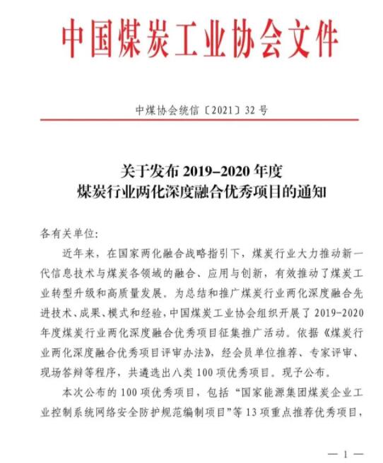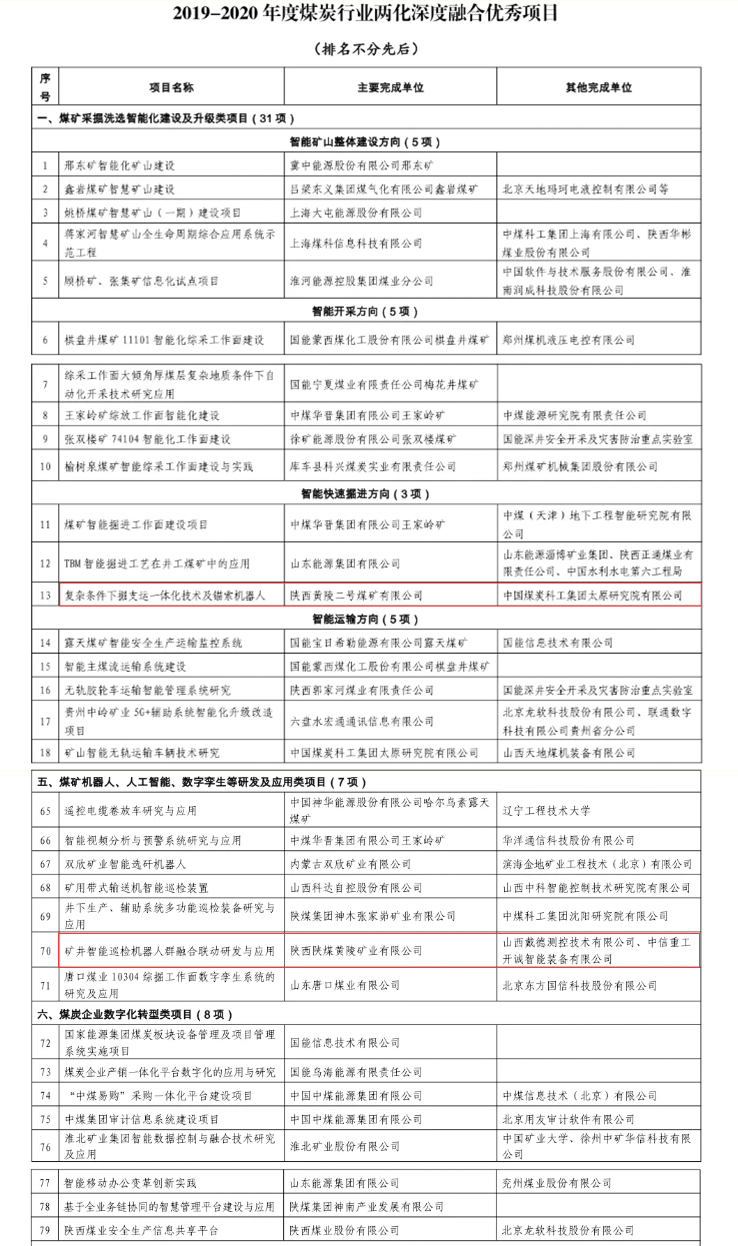 近日,中國煤炭工業(yè)協(xié)會公布了2019—2020年度全國煤炭行業(yè)兩化深度融合100項優(yōu)秀項目,公司以及二號煤礦報送的“礦井智能巡檢機器人群融合聯(lián)動研發(fā)與應(yīng)用”項目、“復(fù)雜條件下掘支運一體化技術(shù)及錨索機器人”項目成功入選。