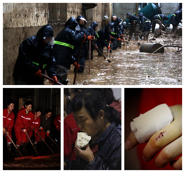 一地黃泥,這是門口,大批從車間里搶救出的物資雜亂地堆在門口的空地上,幾名女工穿著高雨靴手持工具快步走進(jìn)滿是泥濘的車間,我本要跟進(jìn)去,發(fā)現(xiàn)不可能,厚厚的淤泥無法前行,王瑛帶來一雙雨靴,我換上跟著她進(jìn)到車間,整個支護(hù)車間浸泡在淤泥之中,鏟車不斷地將泥水推出去,馬上又被泥水填滿,錨桿生產(chǎn)線設(shè)備失去了本來的模樣,足足100多人在車間內(nèi)將泥水推向門口,大批女職工彎腰清理著,她們是孩子的母親,是妻子,是女兒,此時的她們一身泥水,也沒有了往日女性的柔美,是扛起責(zé)任的女漢子,在眾多女工中我看到了熟人張東霞,她告訴我她們這幾天每天在這里清理14小時以上,回到家里,整個腰根本無法直起來,相比起女工,男職工們根本沒有回家,連續(xù)作戰(zhàn),累了就在休息一會,另外一撥人接著上,因?yàn)椴荒芡#灰O聛?,不用多久泥水又灌入車間。