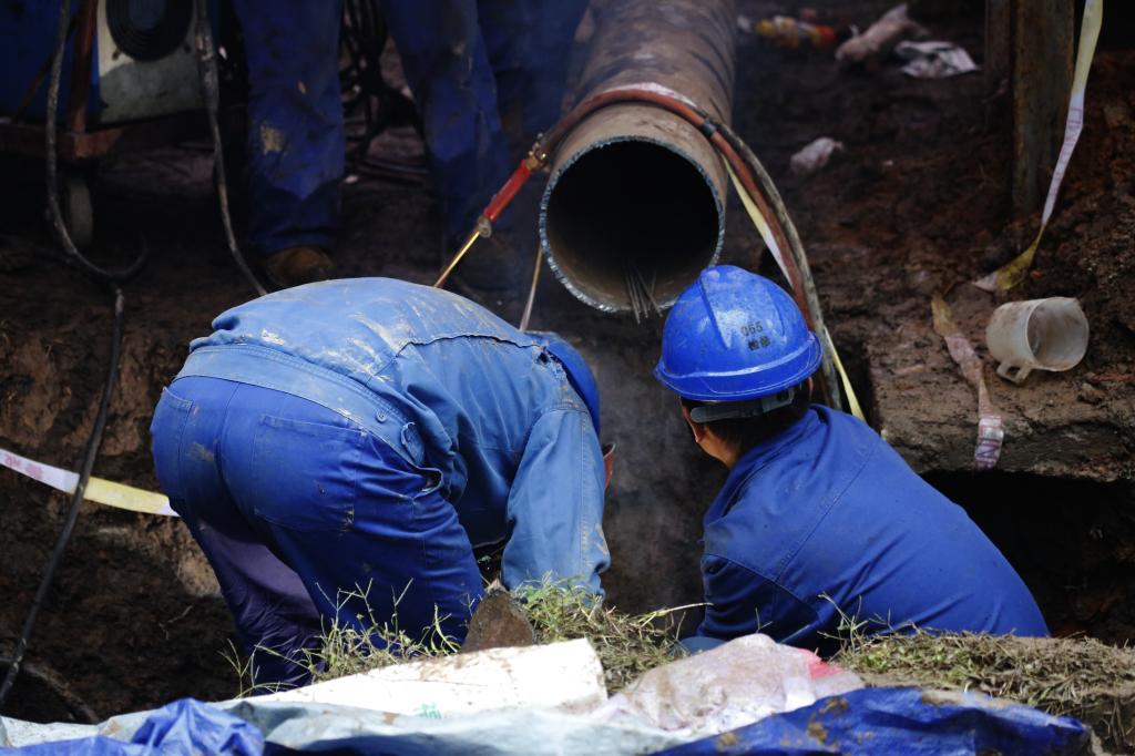 損毀的管道下還是有大量的稀泥,數(shù)十人分兩組正將一根重達(dá)1噸的管子固定連接,管子懸空高度3米之高,5人在管子底部,腳下的泥踩下去就是30公分左右,一旦踩下去,想把腳再拔出來就很難了,管道上也有7個人,將大號螺釘插入連接孔,如此之大的管道,沒放一顆螺釘都是異常困難的,千斤頂,倒鏈挖掘機(jī)齊上陣,雪花中,我注意到他們的嘴唇上的干裂血痕,連續(xù)的工作,他們是甚至沒有時間去喝一口水,我又一次被感動到了。