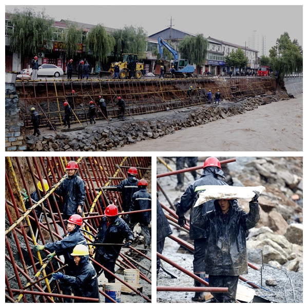 一早我就接到公司宣傳部的報(bào)道任務(wù),店頭片區(qū)各單位受災(zāi)及搶險(xiǎn)情況。雨接著再下,我先去第一站是河濱路被大面積沖垮的公路,龍?jiān)唇ò补緭岆U(xiǎn)人員經(jīng)連續(xù)工作30小時了,垮塌的河堤上支起了腳手架,一車又一車的混凝土被填進(jìn)去,雨下的越來越大,回落的河水又有上漲的趨勢,搶險(xiǎn)人員加快了行動的速度,如果河水再次上漲,之前的工作將前功盡棄。不難看出前線人員臉上的焦慮,卻依然那么不停歇地干著,最大的問題是加速填入混凝土的凝固速度。這段河堤有四處大面積垮塌,最首要的保證沿公路的一側(cè)恢復(fù),這是保障礦區(qū)通往黃陵方向的主干道。