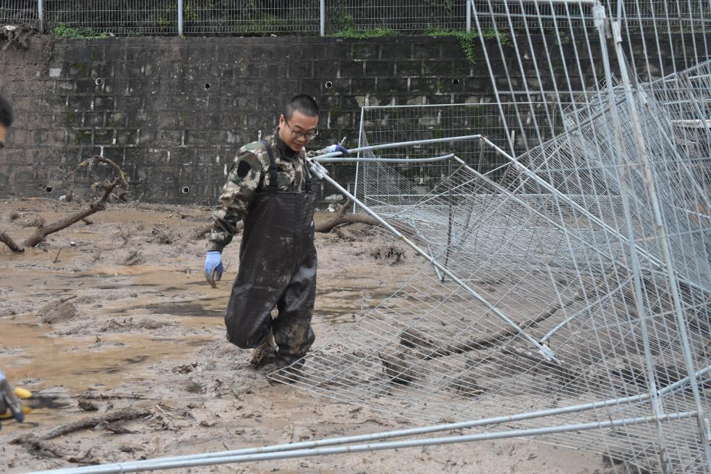 汛情過后,留下了一地的淤泥和被泥石流損壞的模擬巷道框架,看著這一地的狼藉,應(yīng)急救援中心指戰(zhàn)員犯了難。就在大家嘀咕、犯難的時候,突然一個身影出現(xiàn)在了清理現(xiàn)場,他身穿連體雨褲,下到齊腰的水中在吃力地拉著被泥石流損壞的模擬巷道鐵網(wǎng)和鋼管,大家看到入黨積極分子唐英俊在為中心減少汛災(zāi)損失,激發(fā)了指戰(zhàn)員干事的熱情,大家換好雨衣雨褲,也加入了災(zāi)后清理的現(xiàn)場,有的清理淤泥,有的剪拆框架,有的運輸剪拆的鐵網(wǎng)和鋼管……