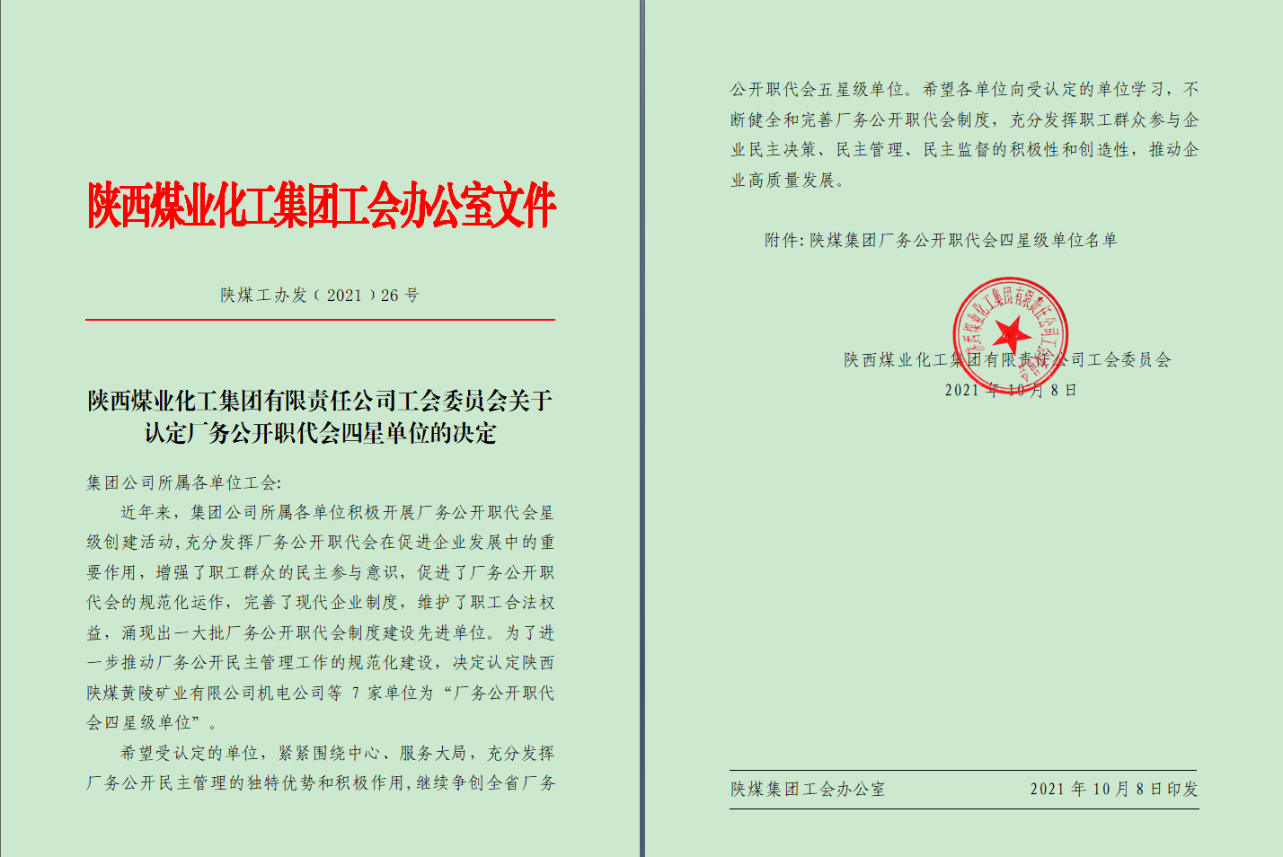 近日,機(jī)電公司“廠務(wù)公開(kāi)職代會(huì)四星級(jí)單位”獲陜煤集團(tuán)工會(huì)認(rèn)定,標(biāo)志著該公司在創(chuàng)建星級(jí)廠務(wù)公開(kāi)職代會(huì)的道路上又向前邁進(jìn)了一大步。