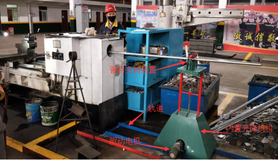 據(jù)了解,車床加工各類鋼管、拔稍數(shù)量很大,以往加工較長(zhǎng)的鋼管需要專人配合車工才能完成,參與加工的人員多,費(fèi)時(shí)費(fèi)工效率低下,還給輔助人員帶來(lái)一定的安全風(fēng)險(xiǎn),而車床遙控自移輔助小車恰恰解決了這些問(wèn)題,該項(xiàng)發(fā)明主要由行走驅(qū)動(dòng)電機(jī)、升降機(jī)構(gòu)電機(jī)、管件夾持裝置、軌道四部分構(gòu)成。小車進(jìn)退采用YS-68KTYZ,28W雙后驅(qū)動(dòng),同步轉(zhuǎn)速為10r/min,推進(jìn)速度為6m/min,小車升降也采用同型號(hào)單電機(jī)驅(qū)動(dòng),控制臺(tái)位于車床左側(cè),控制方便,輔助小車安裝在30×30mm軌道上,加裝有遙控裝置,實(shí)現(xiàn)電動(dòng)送料。