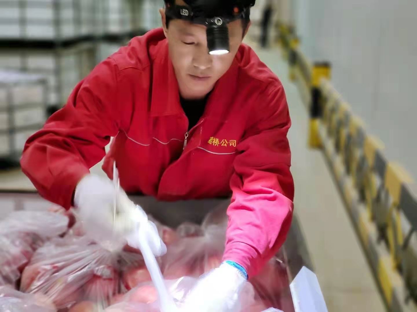 寒風(fēng)凜冽的夜晚,哪里有貨車哪里就有叉車工的身影。他們與低溫作戰(zhàn),積極裝卸周轉(zhuǎn)筐,第一時(shí)間將驗(yàn)收合格的果品過磅稱重并放入冷庫存放。