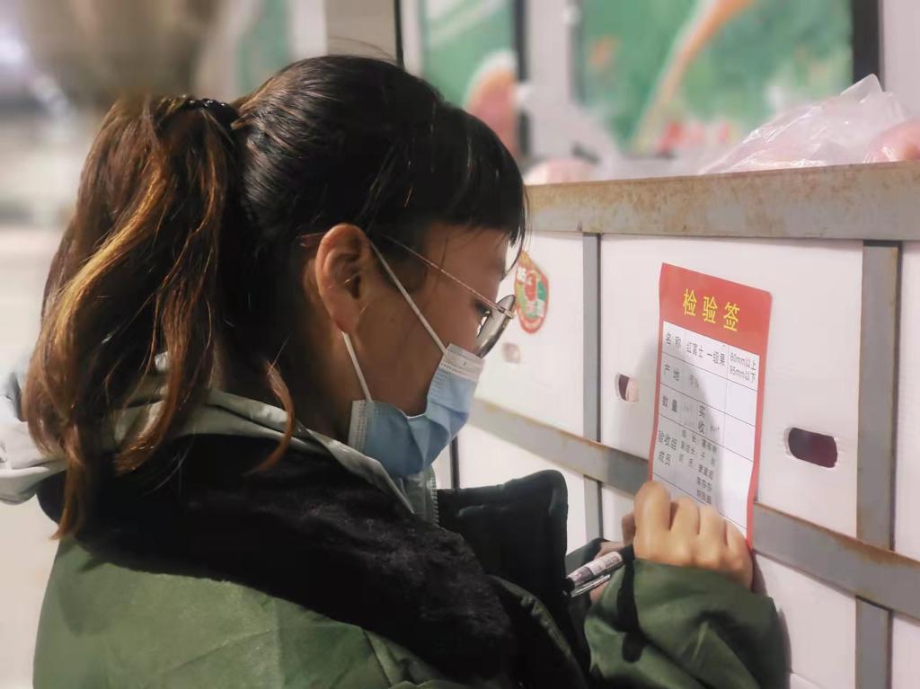 她褪去了漂亮的衣衫,披上樸素的軍大衣,在檢驗(yàn)現(xiàn)場進(jìn)進(jìn)出出,用手中的筆認(rèn)真地記錄著每一框的型號、重量、時(shí)間,一絲不茍,仔細(xì)核驗(yàn)。