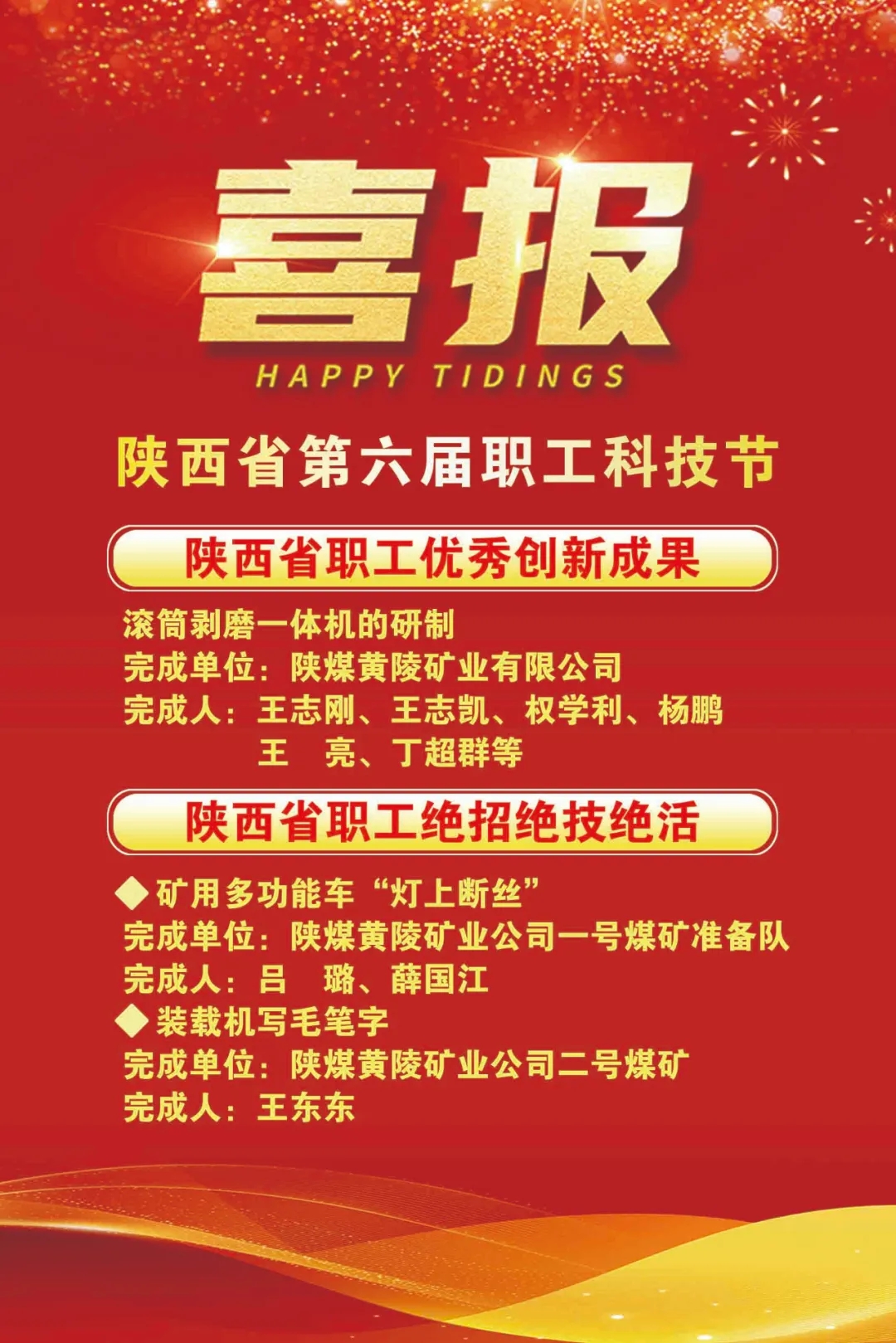 近日,陜西省總工會(huì)、陜西省科學(xué)技術(shù)廳、陜西省人力資源和社會(huì)保障廳、陜西省人民政府國有資產(chǎn)監(jiān)督管理委員會(huì)下發(fā)《關(guān)于表揚(yáng)激勵(lì)陜西省第六屆職工科技節(jié)優(yōu)秀項(xiàng)目和優(yōu)秀組織工作者的通報(bào)》,公司職工創(chuàng)新項(xiàng)目《滾筒剝磨一體機(jī)的研制》榮獲創(chuàng)新成果優(yōu)秀獎(jiǎng),一號(hào)煤礦職工《礦用多功能車“燈上斷絲”》、二號(hào)煤礦職工《裝載機(jī)寫毛筆字》獲評(píng)職工絕招絕技絕活。