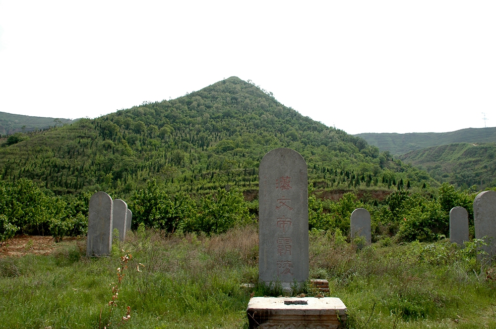 眼前一個巨大的封土,位于農(nóng)田之中,一側(cè)臨近塬畔,封土比南陵要矮幾許,四角均可登頂,整個封土之上,綠草茵茵,異常宜人,放眼遠眺,灞河如同一道絲帶從塬下繞過,河對岸,是另一道大塬橫亙在關(guān)中大地之上,另一面是一條溝壑,沿著溝壑有幾個小村莊。午后,這里便一派清涼了,雖然日頭尚高,但已經(jīng)褪去了火熱,封土之下的農(nóng)田中,似有人在低語,信步而向,果真一名約五十來歲的關(guān)中漢子正在揮舞鋤頭,見有人來,便停了下來,隨即一道盤腿坐于地上。他問我緣何來此,我言只為緬懷故人,他指著封土說,這里面的女人很了不得,都能夠左右了天下。大家旋即大笑,果不然,古跡旁多文人。
