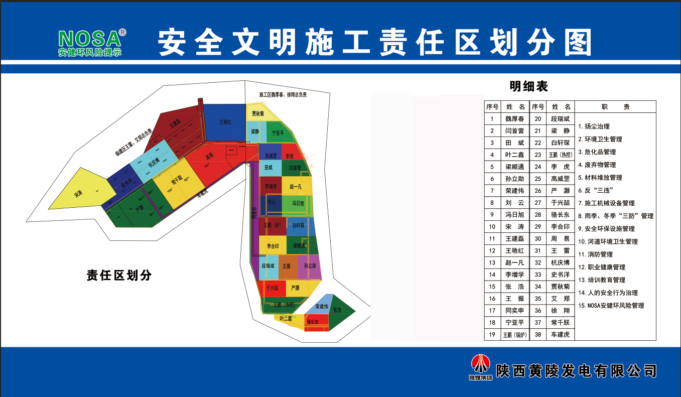 實施基建NOSA特色管理模式。黃陵發(fā)電公司結(jié)合電廠項目建設(shè)特點制定《基建NOSA管理體系建設(shè)的總體方案》,確定了施工過程管理等9大項目,施工組織等52個元素,煙囪、間冷塔等13個區(qū)域,形成完成一個元素,銷號一個元素的NOSA特色管理模式。同時,對基建期在設(shè)計、采購、施工、驗收等多環(huán)節(jié)進行把關(guān),使基建NOSA管理真正成為提升公司安全管理水平的有力抓手,為基建期轉(zhuǎn)生產(chǎn)期的NOSA安健環(huán)管理打下堅實的基礎(chǔ)。