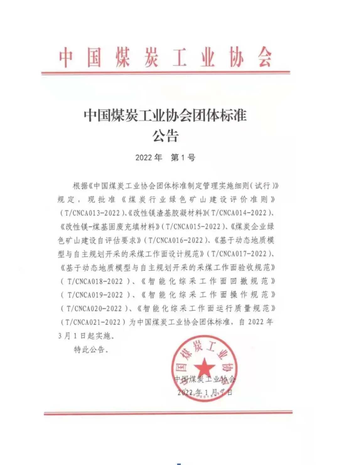 日前,中國煤炭工業(yè)協(xié)會(huì)發(fā)布了2022年第1號(hào)團(tuán)體標(biāo)準(zhǔn)公告,由公司主導(dǎo)完成的“基于動(dòng)態(tài)地質(zhì)模型與自主規(guī)劃開采的綜采工作面設(shè)計(jì)規(guī)范”“基于動(dòng)態(tài)地質(zhì)模型與自主規(guī)劃開采的綜采工作面驗(yàn)收規(guī)范”“智能化綜采工作面運(yùn)行質(zhì)量規(guī)范”“智能化綜采工作面操作規(guī)范”“智能化綜采工作面回撤規(guī)范”5項(xiàng)中國煤炭工業(yè)協(xié)會(huì)團(tuán)體標(biāo)準(zhǔn)正式發(fā)布。