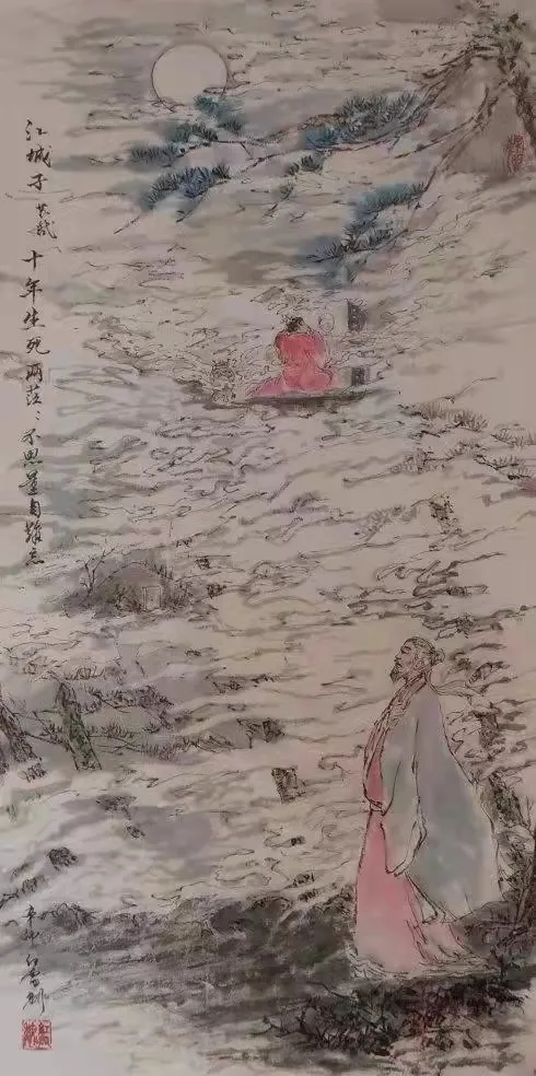第一首,蘇軾在山東密州時(shí)寫的《江城子》。有一天,蘇軾夢(mèng)見了十年前的亡妻王弗,醒來之后心情極其激動(dòng)又傷感,久久不能平息。需要解釋一下,王弗是蘇軾在老家四川眉山迎娶的原配妻子,聰明干練,孝順公婆,在家族人人稱贊。而且王弗也是書香門第,其父親是鄉(xiāng)貢進(jìn)士,她和蘇軾在一起夫唱婦隨,紅袖添香,恩愛有加。只可惜她和蘇軾成婚十年后,不幸病逝。在這十年間,蘇軾進(jìn)京趕考,忙于功名事業(yè),夫妻二人聚少離多,但感情一直深厚。蘇軾這天做夢(mèng),恰在妻子去世后的又一個(gè)十年,他寫道:“十年生死兩茫茫,不思量,自難忘,千里孤墳,無處話凄涼。”悲愴之氣,穿越陰陽兩界的愛戀和思念之情,通過這幾行字直接撞擊讀者心房,縱有鐵石心腸也會(huì)動(dòng)情。