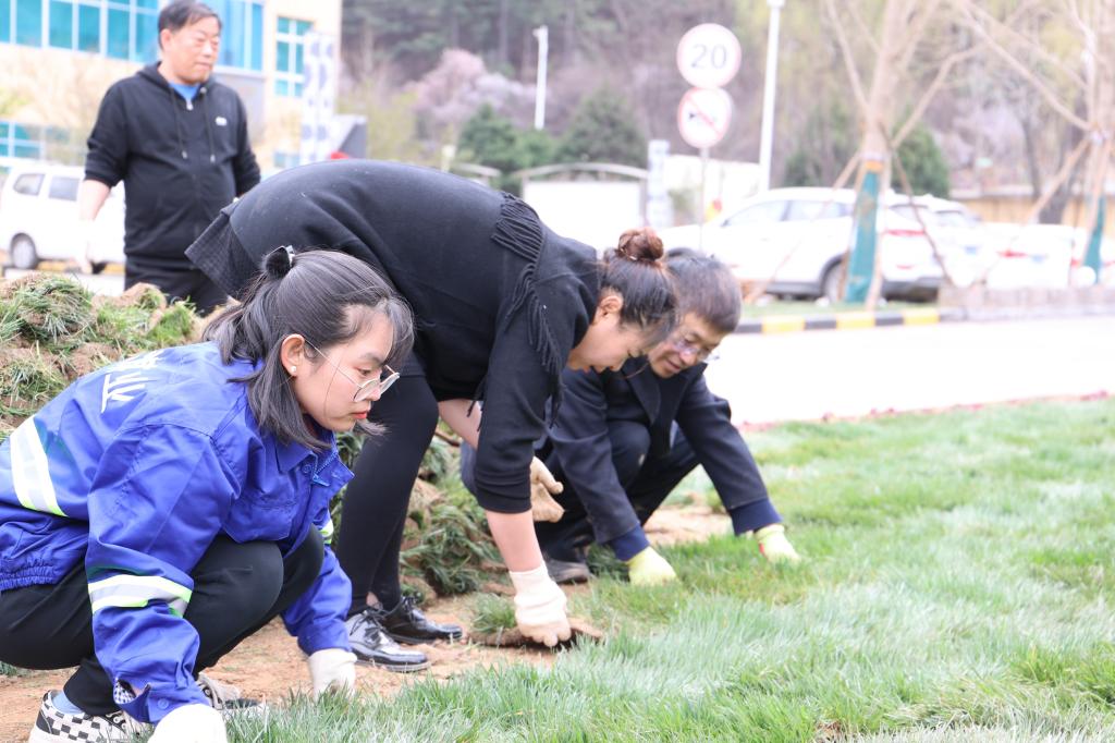 在綠化現(xiàn)場,所有參與勞動的干部職工,熱情高漲,在現(xiàn)場專業(yè)人員的指揮下,一塊塊草皮,一棵棵樹種從車上卸下后,及時進行了種植和鋪設(shè),一寸寸原先黃土裸露的地面也漸漸地穿上了綠衣裳,望著眼前的巨大變化,大家的臉上都掛上了充滿希望的幸福笑容。