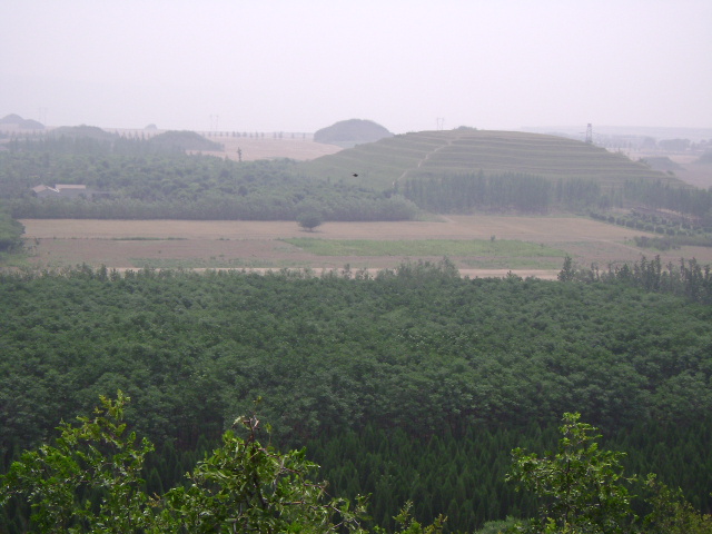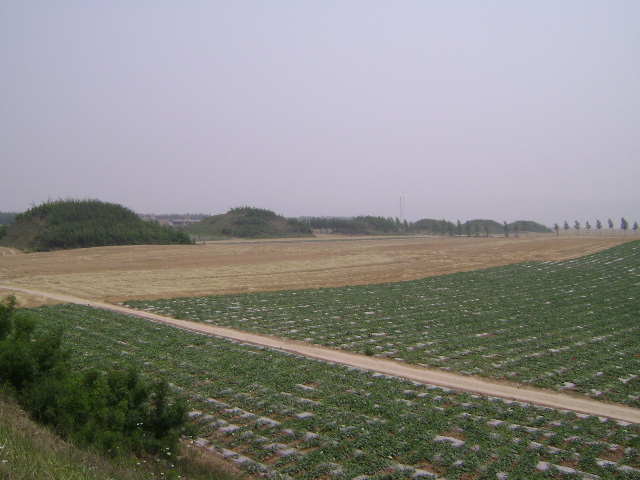 再次踏入杜陵是幾年后的一個(gè)秋天。天高云淡,正是出行好時(shí)節(jié),午后乘車出發(fā),依然是在朦朧中被叫醒,購(gòu)票進(jìn)入后,懷著尊崇之情繞道封土的東南側(cè),這里是一大片人工銀杏林,恰逢落葉季節(jié),遍地金黃,實(shí)不忍心踩上去,就只好繞著銀杏林走了一圈后進(jìn)入南側(cè)的麥田之中,遠(yuǎn)遠(yuǎn)的便望見一堆人工挖掘的黃土,在好奇心的驅(qū)使下快步近身一探究竟。這是一個(gè)大約不到兩個(gè)平米的小土坑,翻出的黃土中可見殘磚碎瓦,可能是耕種之人無(wú)意中所致吧。不遠(yuǎn)處,王皇后的封土之上,幾名滑翔愛好者或欲從高處滑落,或身背滑翔傘正在吃力地朝上爬。緊跟其后趴到封土頂部放眼四望,除了西邊的杜陵封土之外,再無(wú)遮擋物,一切盡收眼底,東側(cè)兩排排列整齊大小不一的封土如同兩列守衛(wèi),時(shí)刻警惕地守護(hù)著杜陵。在北側(cè)不遠(yuǎn)處的一片果園中,一座不大的封土格外顯眼,那里便是省城南郊著名的東三爻村。五代十國(guó)時(shí)期的前蜀后主王衍在投降后唐被押解至洛陽(yáng)途中,路經(jīng)長(zhǎng)安時(shí)被后唐李存勖派人殺害,葬于東三爻村。難道眼前的這個(gè)封土是王衍的陵墓,后經(jīng)幾次親身前去訪古才弄明白,此陵也為杜陵的陪葬墓或者是附屬建筑遺址之一,而王衍的葬身地早就已經(jīng)淹沒在了歷史的長(zhǎng)河中。