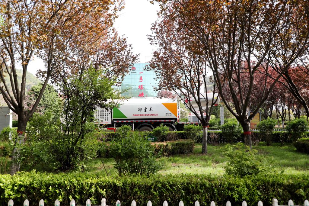 六月的清晨,氣溫宜人,早霞穿過(guò)礦區(qū)茂密的樹(shù)林,透過(guò)晨霧,從密密層層的枝葉間透射下來(lái),地上印滿銅錢般大小的光斑。剛進(jìn)入礦區(qū),一輛掃地車迎面駛來(lái),在掃地車的后面緊跟著抑塵霧炮灑水車,車后留下一路干凈清爽。