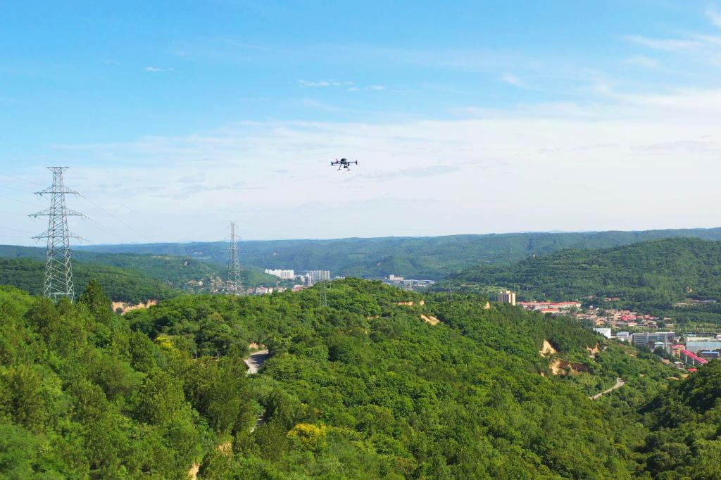 7月13日上午,一號煤礦三號風(fēng)井附近的山區(qū)里,一架無人機(jī)攀升之后盤旋在半空中。
