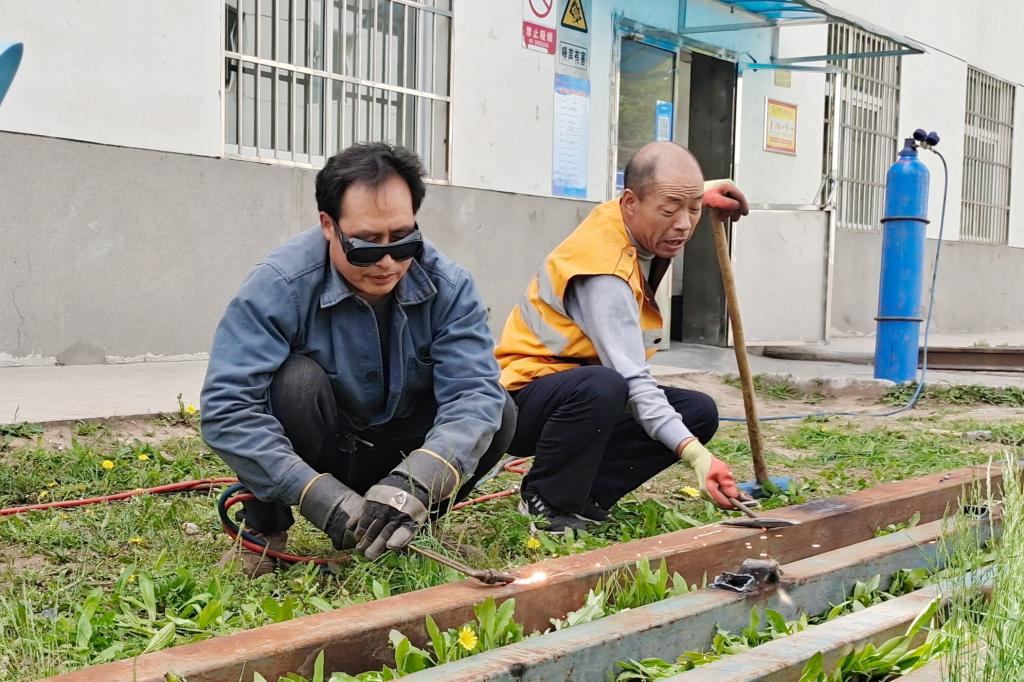 夏日的陽光透過窗戶照在工務(wù)段,設(shè)備庫房整整齊齊擺放著三層手持搗固鎬,庫房外,焊補(bǔ)班組張光偉正用焊槍,點(diǎn)焊因強(qiáng)震動出現(xiàn)裂紋的鋼板。