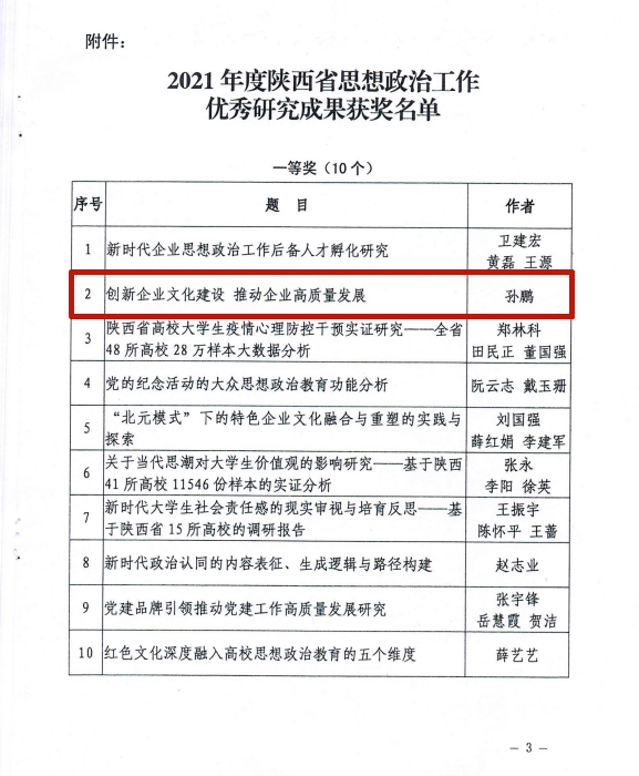 近日,陜西省2021年度思想政治工作研究成果評(píng)選揭曉,黃陵礦業(yè)報(bào)送的《創(chuàng)新企業(yè)文化建設(shè) 推動(dòng)企業(yè)高質(zhì)量發(fā)展》獲得陜西省思想政治工作優(yōu)秀研究成果一等獎(jiǎng)。