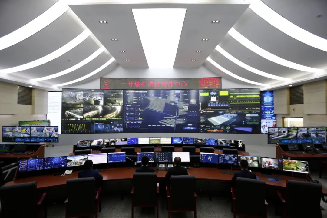 走進(jìn)地面調(diào)度指揮中心,顯示屏上實(shí)時(shí)顯示著綜采工作面、井下重要設(shè)備硐室等視頻畫面。