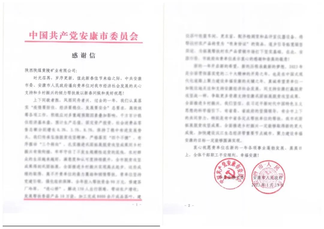 近日,安康市委、市政府發(fā)來(lái)感謝信,對(duì)公司長(zhǎng)期以來(lái)對(duì)安康市經(jīng)濟(jì)社會(huì)發(fā)展的關(guān)心支持和鄉(xiāng)村振興傾力幫扶表示衷心感謝。