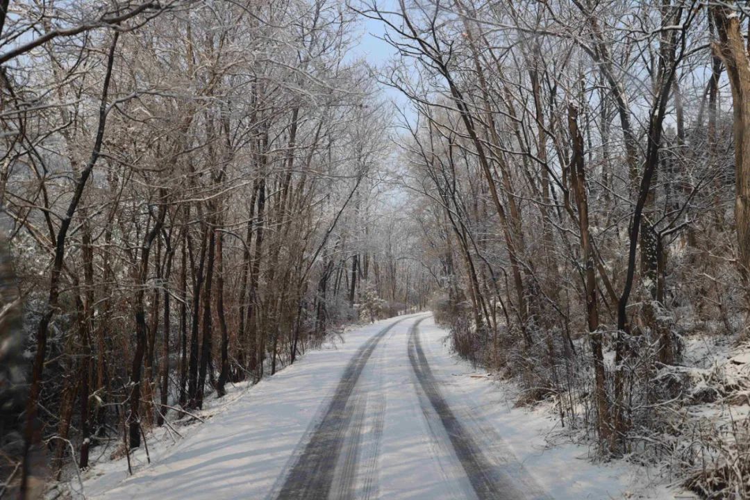 繁忙的道路失去了往日的顏色,只留下兩行模糊的車轍。看來,已經(jīng)有人穿越了這場春雪。車速當(dāng)然不能太快,任何一個人都想用眼光去捕捉身邊的每一絲絕美,那些被壓彎了腰身的樹木,以及僅僅露出頭頂?shù)幕牟?,都在用特殊的方式去迎接每一個人?;秀遍g,已行至山中,太陽也逐漸升高,為兩側(cè)的山巒披上一身耀眼銀裝,薄霧也不知何時都已經(jīng)完全散去,銀峰白嶺之上是深邃的藍(lán),交相輝映,美輪美奐。