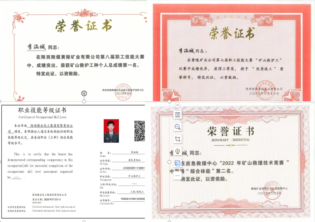 寶劍鋒從磨礪出,梅花香自苦寒來。自2020年入隊(duì)以來,李涵城憑借出眾的技術(shù)和艱苦訓(xùn)練榮獲了多項(xiàng)榮譽(yù)。2020年6月,李涵城參加黃陵礦業(yè)公司第七屆職工技能大賽“礦山救護(hù)工”比賽,憑借他扎實(shí)的專業(yè)知識(shí)和快速的反應(yīng)能力,獲得了三等獎(jiǎng);2021年5月,在“我要上全運(yùn)·奮進(jìn)十四五”陜煤集團(tuán)職工健步跑公開越野賽(關(guān)中賽區(qū))獲得第三名的好成績(jī);2022年5月,李涵城毫不松懈,在黃陵礦業(yè)公司第八屆職工技能大賽中以穩(wěn)定的表現(xiàn)獲得了礦山救護(hù)工種個(gè)人總成績(jī)第一名的好成績(jī);2023年2月,在應(yīng)急救援中心“2022 年在礦山救援技術(shù)競(jìng)賽”中取得了綜合體能第二名;此次“華陽(yáng)杯”全國(guó)煤炭行業(yè)職業(yè)技能競(jìng)賽,李涵城斬獲了礦山救護(hù)工二等獎(jiǎng),更是為自己的職業(yè)生涯再添佳績(jī),也刷新了黃陵礦業(yè)應(yīng)急救援中心多年來榮獲個(gè)人最高獎(jiǎng)項(xiàng)記錄。他獲得的這些不僅僅是榮譽(yù),更是他數(shù)年如一日的堅(jiān)持和努力最好的見證