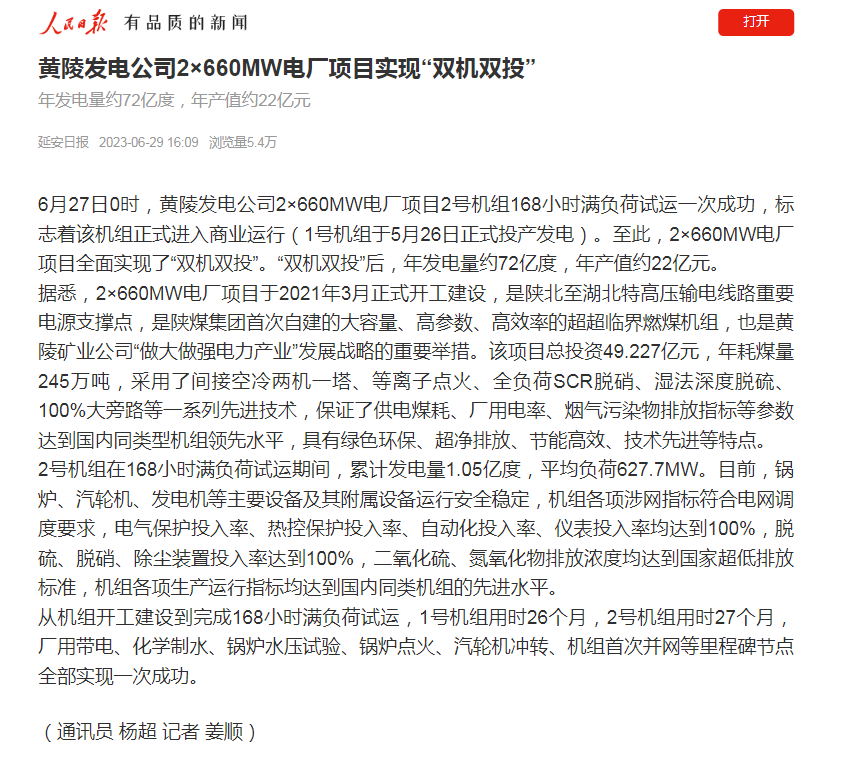 6月27日0時(shí),黃陵發(fā)電公司2×660MW電廠項(xiàng)目2號(hào)機(jī)組168小時(shí)滿負(fù)荷試運(yùn)一次成功,標(biāo)志著該機(jī)組正式進(jìn)入商業(yè)運(yùn)行(1號(hào)機(jī)組于5月26日正式投產(chǎn)發(fā)電)。至此,2×660MW電廠項(xiàng)目全面實(shí)現(xiàn)了“雙機(jī)雙投”?!半p機(jī)雙投”后,年發(fā)電量約72億度,年產(chǎn)值約22億元。