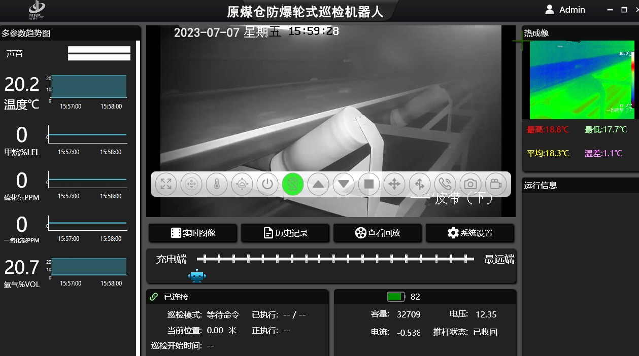 “原煤倉倉頂環(huán)境溫度20.2℃,設(shè)備運(yùn)轉(zhuǎn)正常,皮帶無跑偏,機(jī)架無變形……”防爆輪式巡檢機(jī)器人第一時(shí)間就全面掌握原煤倉環(huán)境及設(shè)備運(yùn)行情況,并實(shí)現(xiàn)同步傳送巡查信息。巡檢機(jī)器人搭載有30倍光學(xué)調(diào)焦可見光攝像機(jī),實(shí)時(shí)采集傳送沿軌道方向的整體巷道現(xiàn)場情況,攝像儀集成云臺(tái)、紅外熱像儀、可見光攝像機(jī)及補(bǔ)光燈,可以精準(zhǔn)記錄設(shè)備運(yùn)行溫度、煙霧預(yù)警、異物識(shí)別、紅外檢測等信息,通過捕捉設(shè)備輻射的熱紅分線,能夠準(zhǔn)確檢測設(shè)備表面溫度,形成熱視圖像,直觀展示設(shè)備溫度分布情況,一旦發(fā)現(xiàn)問題,系統(tǒng)就會(huì)自動(dòng)發(fā)出警報(bào),實(shí)現(xiàn)設(shè)備運(yùn)行故障超前預(yù)判、預(yù)警。