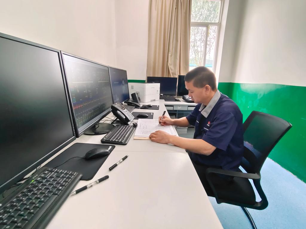 “設(shè)備運(yùn)行正常?!?點30分,張立民撥通電力調(diào)度的電話匯報設(shè)備運(yùn)行情況并記錄著參數(shù)。