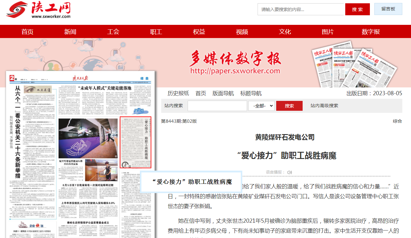 “是你們給了我們家人般的溫暖,給了我們戰(zhàn)勝病魔的信心和力量……”近日,一封特殊的感謝信張貼在黃陵礦業(yè)煤矸石發(fā)電公司門口。寫信人是該公司設(shè)備管理中心職工張世杰的妻子張新娟。