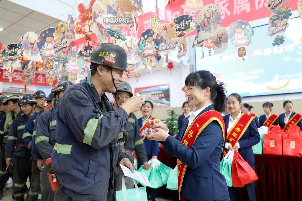 “師傅,您辛苦了,吃塊月餅吧,提前祝您及您的家人中秋快樂!”在井口信息站,家屬協(xié)管員把帶有甜蜜與溫暖月餅、蘋果送給正準(zhǔn)備下井的礦工們,叮囑他們牢記安全、遵章作業(yè)。