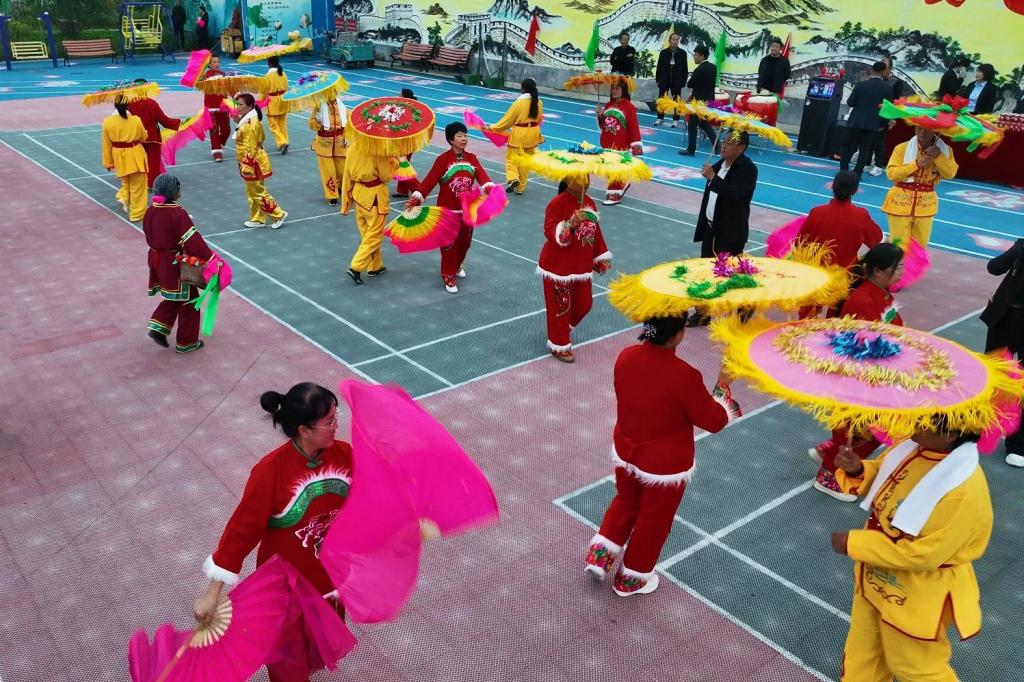 40余人組成方陣呈兩路縱隊排開,一陣密集厚重的鼓聲暫停后,表演正式進入高潮階段,舞花傘的、弄流蘇的、搖綢扇的,所有人都伴隨喜慶的音樂踩著“十字”舞步,活動現(xiàn)場,一派熱鬧非凡。