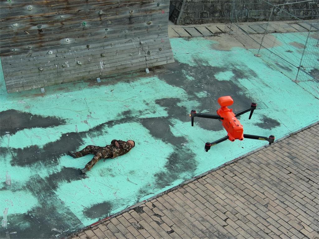 “發(fā)現(xiàn)目標(biāo),無人機(jī)立即抵近查看,疑似發(fā)現(xiàn)受傷人員……”在救援中心開展的救援演練現(xiàn)場(chǎng),搭載喊話器的無人機(jī)引導(dǎo)地面搜救力量,尋找被困人員。