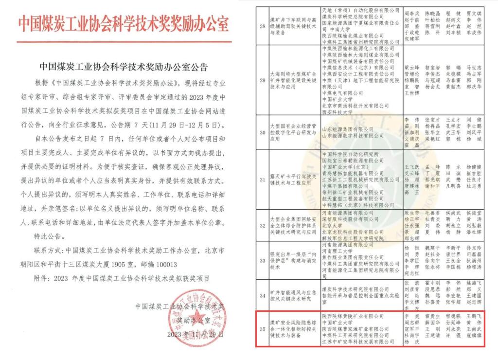 日前,中國(guó)煤炭工業(yè)協(xié)會(huì)公布了2023年度“中國(guó)煤炭工業(yè)協(xié)會(huì)科學(xué)技術(shù)獎(jiǎng)”獲獎(jiǎng)項(xiàng)目名單,公司聯(lián)合中國(guó)礦業(yè)大學(xué)李爽教授團(tuán)隊(duì)共同研發(fā)的“煤礦安全風(fēng)險(xiǎn)隱患綜合一體化智能防控關(guān)鍵技術(shù)與裝備”項(xiàng)目榮獲2023年度中國(guó)煤炭工業(yè)協(xié)會(huì)科學(xué)技術(shù)獎(jiǎng)一等獎(jiǎng)。