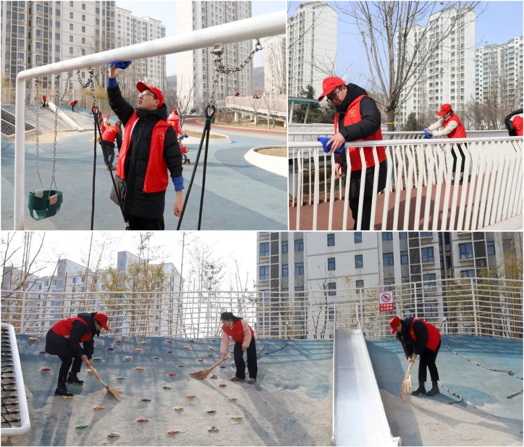 擦洗護(hù)欄、健身器材等公共設(shè)施上的灰塵,清理綠化帶枯枝敗葉,清理塑膠跑道、人行棧橋區(qū)域的垃圾,一個(gè)個(gè)干勁十足,分工明確,這一派熱火朝天的勞動(dòng)景象呈現(xiàn)在小區(qū)公園各個(gè)角落。