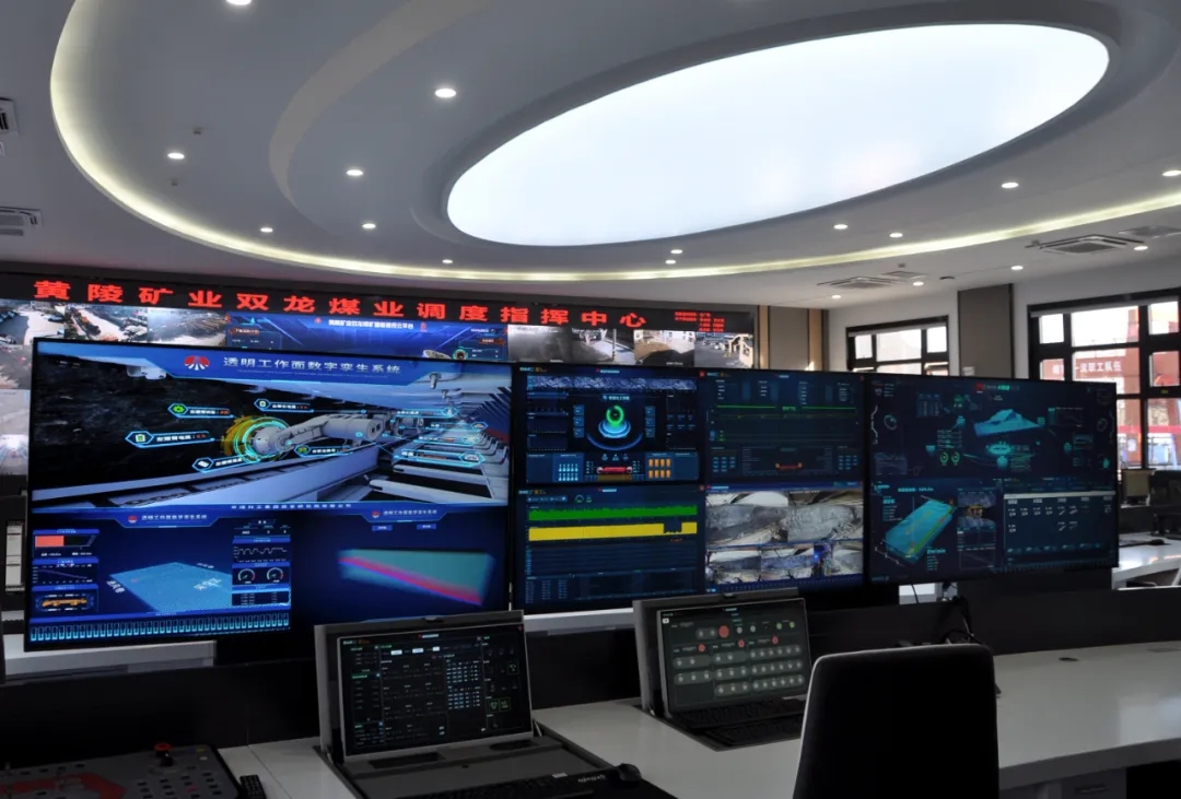瓦斯抽采、火災(zāi)預(yù)警、人員精確定位、可視化精準采煤……走進雙龍煤業(yè)指揮調(diào)度中心,井下的各區(qū)域和生產(chǎn)過程都 顯示在大廳的各個區(qū)域顯示屏上。