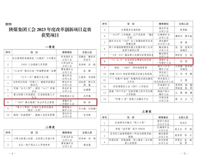 近日,陜煤集團(tuán)工會(huì)2023年度改革創(chuàng)新項(xiàng)目競(jìng)賽落下帷幕,公司二號(hào)煤礦《“3445”模式推進(jìn)廠務(wù)公開(kāi)民主管理》項(xiàng)目榮獲一等獎(jiǎng),一號(hào)煤礦《“心.立.方”安全協(xié)管品牌建設(shè)的創(chuàng)新實(shí)踐》項(xiàng)目榮獲二等獎(jiǎng)。
